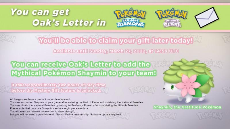 오크의 편지 미스터리 선물을 받으면 샤이민을 만나 신화의 포켓몬을 잡아서 팀에 추가할 수 있습니다. 예고편에서 알 수 있듯이 Brilliant Diamond와 Shining Pearl의 새로운 플레이에서 Mystery Gift 기능이 잠금 해제되기까지 플레이 시간은 약 2시간입니다.