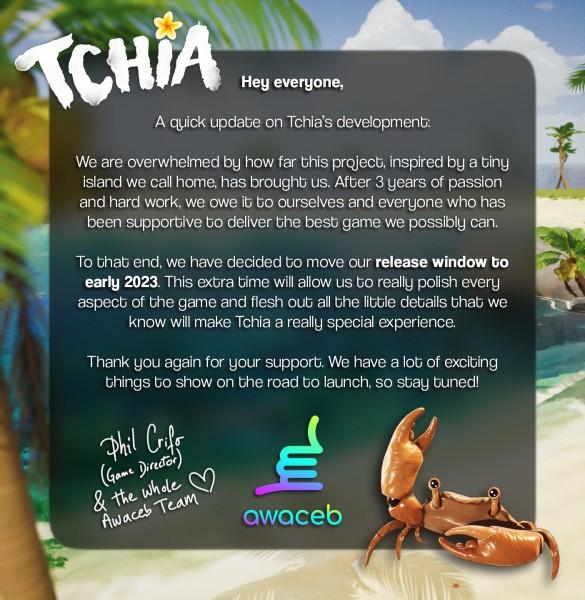 개발자 Awaceb는 Twitter에 업데이트를 게시하여 게임을 더 수정해야 한다고 설명하면서 부분적으로는 “이 추가 시간을 통해 게임의 모든 측면을 실제로 연마하고 우리가 알고 있는 모든 작은 세부 사항을 구체화할 수 있을 것입니다. Tchia를 정말 특별한 경험으로 만드십시오.”