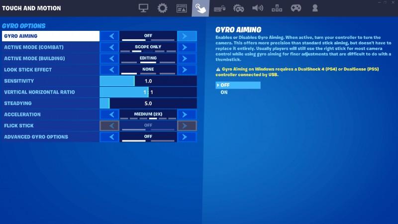 Epic Games 블로그 게시물에는 “설정의 ‘터치 및 모션’ 탭에서 자이로 컨트롤을 활성화 또는 비활성화합니다.”라고 나와 있습니다. “‘자이로 조준’을 켜거나 끄면 됩니다. 켜져 있으면 컨트롤러를 돌려 카메라를 제어할 수 있습니다. 이것은 표준 스틱 조준보다 더 정밀하지만 완전히 교체할 필요는 없습니다. 일반적으로 플레이어는 대부분의 카메라 제어를 위해 여전히 오른쪽 스틱을 사용하고 썸스틱으로는 하기 어려운 미세한 조정을 목표로 자이로를 사용합니다.”