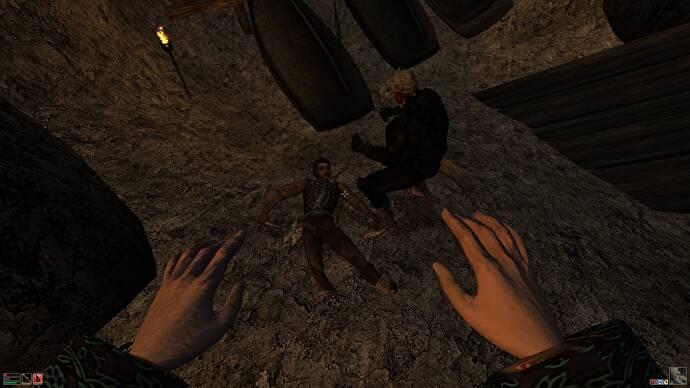 그런 다음 경비원 중 한 명이 움직이고 계단을 내려가는 Morrowind 길로 성큼성큼 걸어 내려가기 시작합니다. 나는 내 파트너에게 Cyrodillic Wine에 대한 그녀의 습격을 마무리하고 그곳에서 나가라는 신호를 보냅니다. 그녀는 탈출하지만 – 그녀는 도벽광인 – 나가는 길에 자루에서 코를 킁킁거리는 것을 저항할 수 없습니다. 우리는 펠라기아드의 교차로 마을에서 즉시 도망자가 되어 도망칠 수밖에 없었습니다. Morrowind에서 우리의 자유분방한 협동 모험의 첫 번째 반전이며 이러한 전통적인 Bethesda RPG 속임수를 함께 하게 되어 기분이 좋습니다.