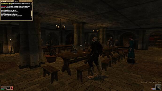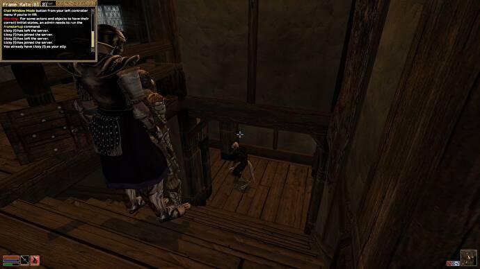 나, 브르타뉴어 마법사 Vidal von Astral은 내 파트너인 ‘Lizzy’가 지나가는 아르고니안 암살자가 분주한 선술집의 와인 저장고로 몰래 내려가는 것을 지켜보고 있습니다. 나는 ‘잠입’이라고 말하지만 실제로는 고풍스럽지만 사랑스러운 Morrowind 애니메이션 시스템과 그녀의 도마뱀 다리의 디지털 구조는 그녀가 시청자에게 *그들이’ 뭔가 사악한 *. 경비원은 그녀가 모퉁이를 돌고 내려가는 것을 지켜보면서도 그녀를 따르겠다고 약속하지 않은 채 혼란스러워하는 것처럼 보입니다.