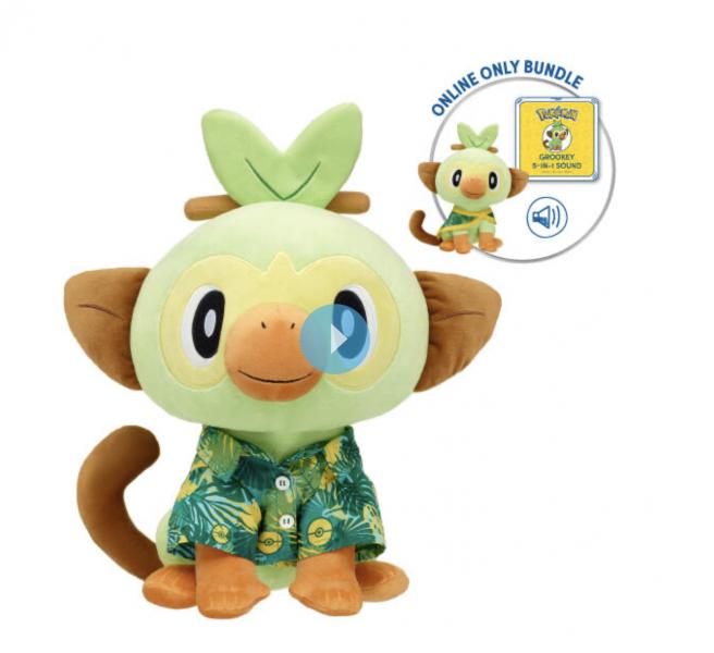 이 번들에 대한 사이트 설명은 “Grookey와 함께 그루브에 빠져들기”입니다. “이 친절한 포켓몬은 항상 당신의 옆에 붙어 있습니다. 호기심 많은 그루키는 녹색 털, 큰 눈과 귀, 곱슬곱슬한 갈색 꼬리를 가진 풀 타입 포켓몬입니다. 포켓몬 트레이너는 Grookey의 잎사귀 프린트 셔츠, 어울리는 망토, 5-in-1 사운드 칩이 포함된 이 독점적인 Grookey 봉제 장난감 번들을 좋아할 것입니다.”